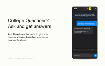 Ace AI, üniversite başvuru sürecinde öğrencilere yardım etmek için tasarlanmış bir Chrome uzantısıdır. Bu araç, kullanıcıların makalelerini geliştirmelerine, etkinlik tanımlarını optimize etmelerine ve başvuru stratejileri oluşturmalarına olanak tanır. Anında uzman geri bildirimi sağlayarak, Google Dokümanlar veya başvuru web siteleri gibi herhangi bir sayfada çalışırken destek sunar.